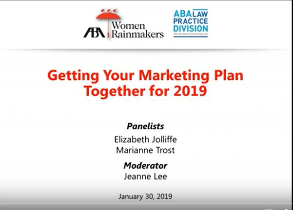 If you don’t have a plan and you don’t know where to start, listen to this free ABA webinar, Getting Your Marketing Plan Together For 2019. It aired last January. In it, Marianne Trost and I discuss how to create a plan that works for you, no matter where you are in your legal career. If you would like a copy of the one page plan template we walk through, and/or help creating or actually implementing a business development plan for your law practice, please feel free to contact me. And as we all know, implementation is essential!